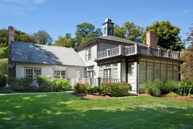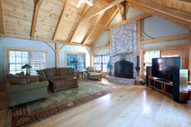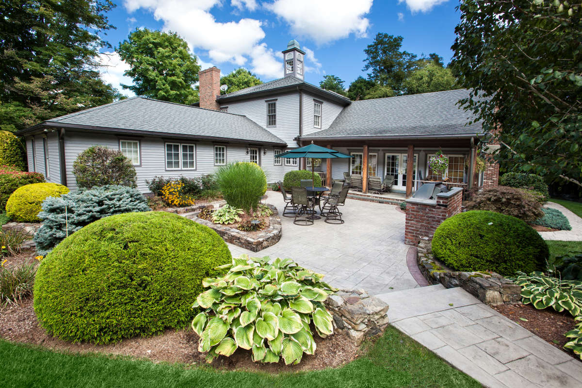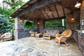 8" oak post and beam exposed timber framing, 18' high oak ridge beam cathedral ceiling & a 5' by 4' antique Rumford-style fireplace and hearth make this room breath taking. Head out any one of the 3 French doors to the 29' by 7' covered blue-stone & redwood porch which then leads to the Rear Patio/Grilling Area.