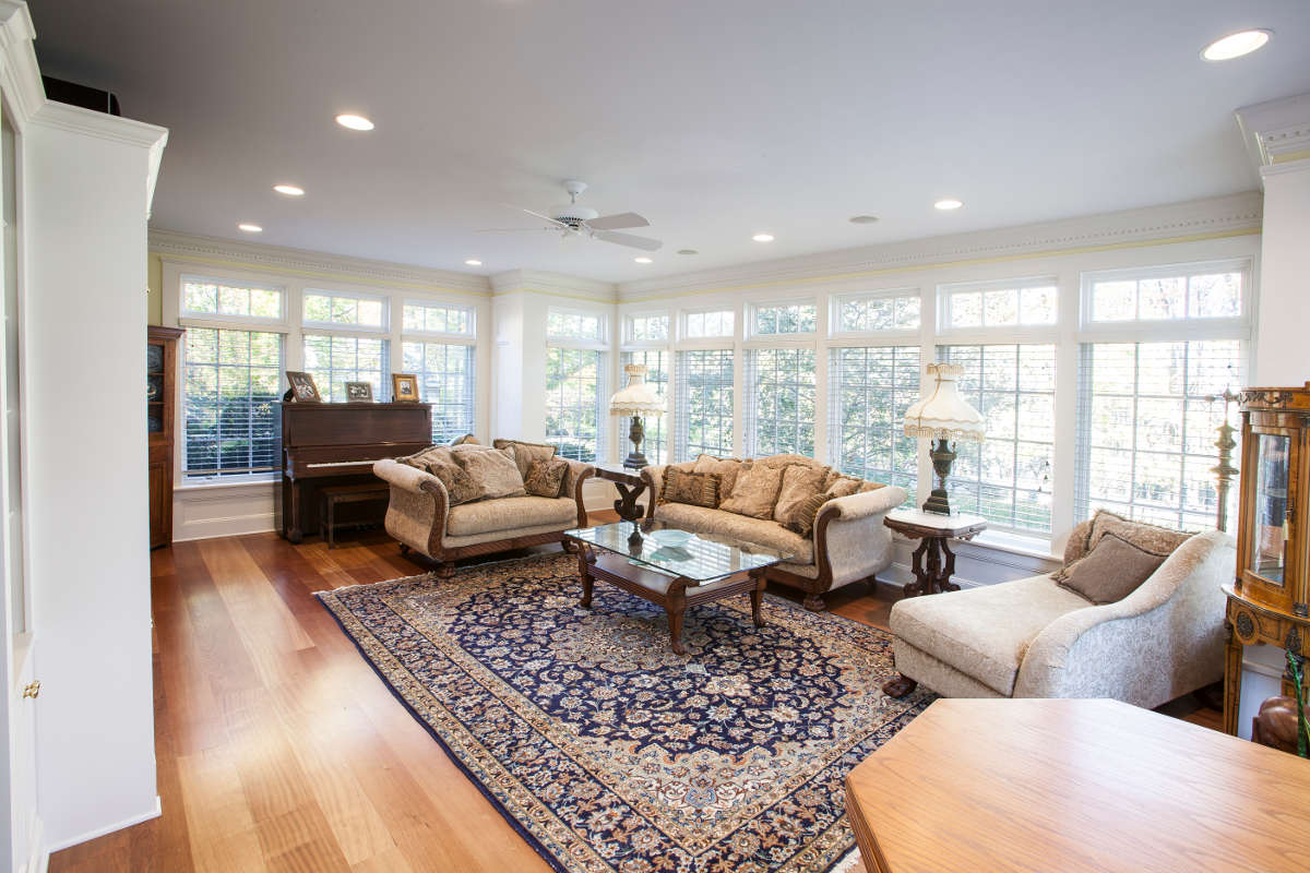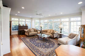 3 walls of shoulder to shoulder casement windows with transom lights above saturate the 25' 6" by 17' 6" Sun Room with natural light. There is a custom built-in entertainment center and random width Brazilian cherry floors. French doors lead out to the exotic ipe (ironwood) deck in the rear of the Sun Room and is separated from the Dining Room by another set of French doors.