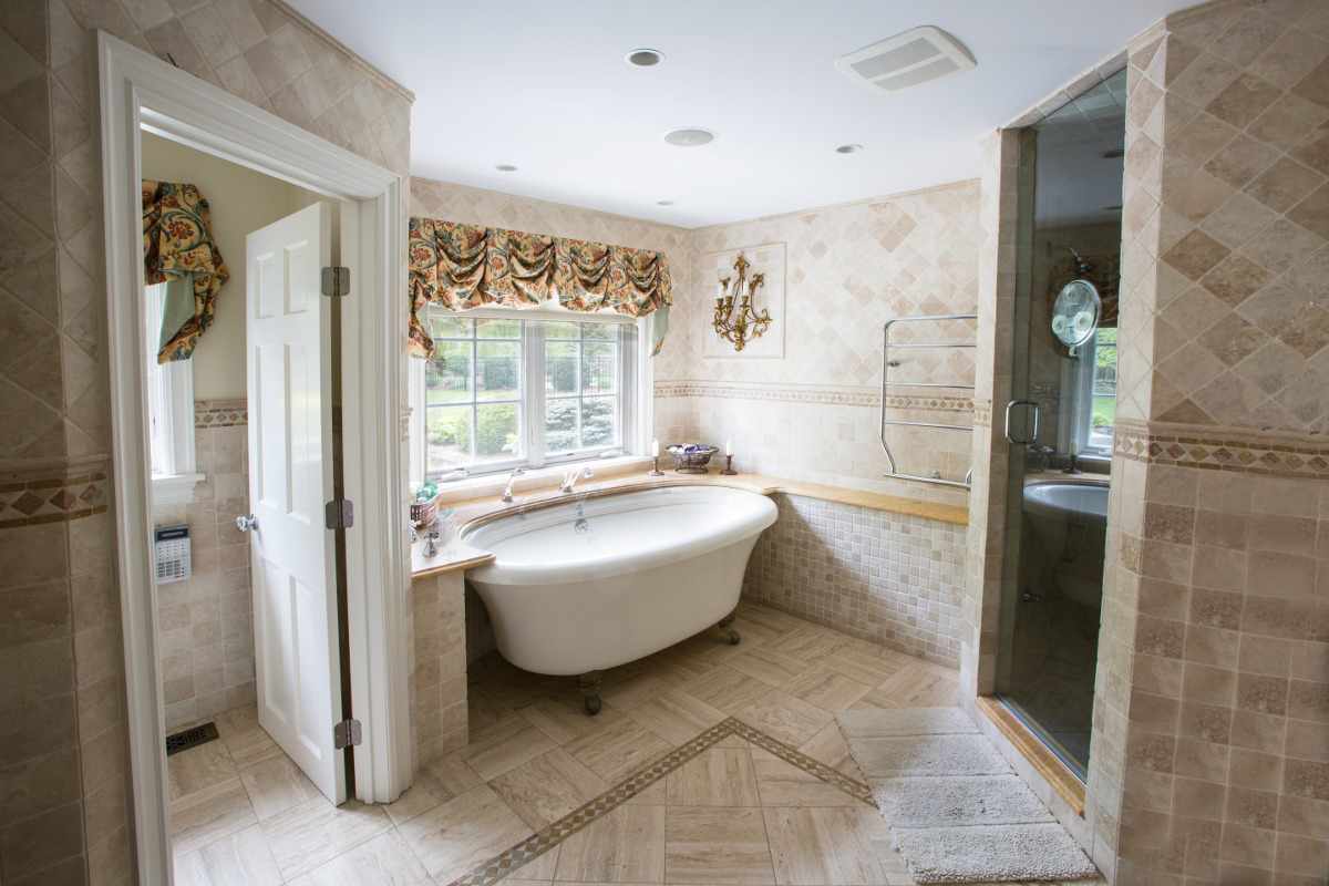 A converted antique Bombay style triple dresser is the base of the his and hers double sinks. A dedicated continuous-loop zone ensures instant hot water at all times. There is polished granite tile on the floor, Heliodor honed-limestone on all horizontal surfaces, floor to ceiling tumbled marble walls with natural-stone chair rail and crown accents.