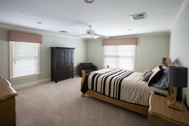Measures 14'10" by 14'10", this bedroom has neutral wall to wall carpeting, a 5' by 5' walk-in closet, crown molding, recessed LED lighting and a Casablanca paddle fan.