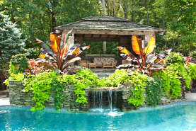 The upper level spa cascades heated water over the natural stone waterfall spill over. Heavily landscaping enhances the beauty of this area. The Gazebo in the rear is a perfect place to escape the sun and perhaps take a nap on a lounge chair or have a drink to cool off.
