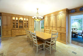 The heart of the Main House is the 21' by 25' Kitchen. Plentiful custom built Old English style knotty pine cabinets and a floor to ceiling pantry and breakfront provide tons of storage. The gourmet appliances include a Thermador double oven, 6 burner Viking down draft gas cook top, Sub Zero refrigerator, Miele dishwasher and Miele auto grind coffee, cappuccino and espresso machine.