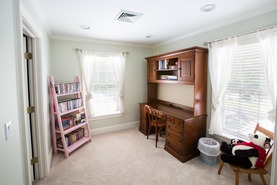 The 10'10" by 9'10" First Floor Office has 2 computer work stations, custom built-in upper and lower maple cabinets and hanging file drawers, granite counter tops and a tumbled marble backsplash. Not only is there recessed LED lighting, but under cabinet halogen accent lighting, too. Data outlets for fax and printers and house wide server hub to make things easier.