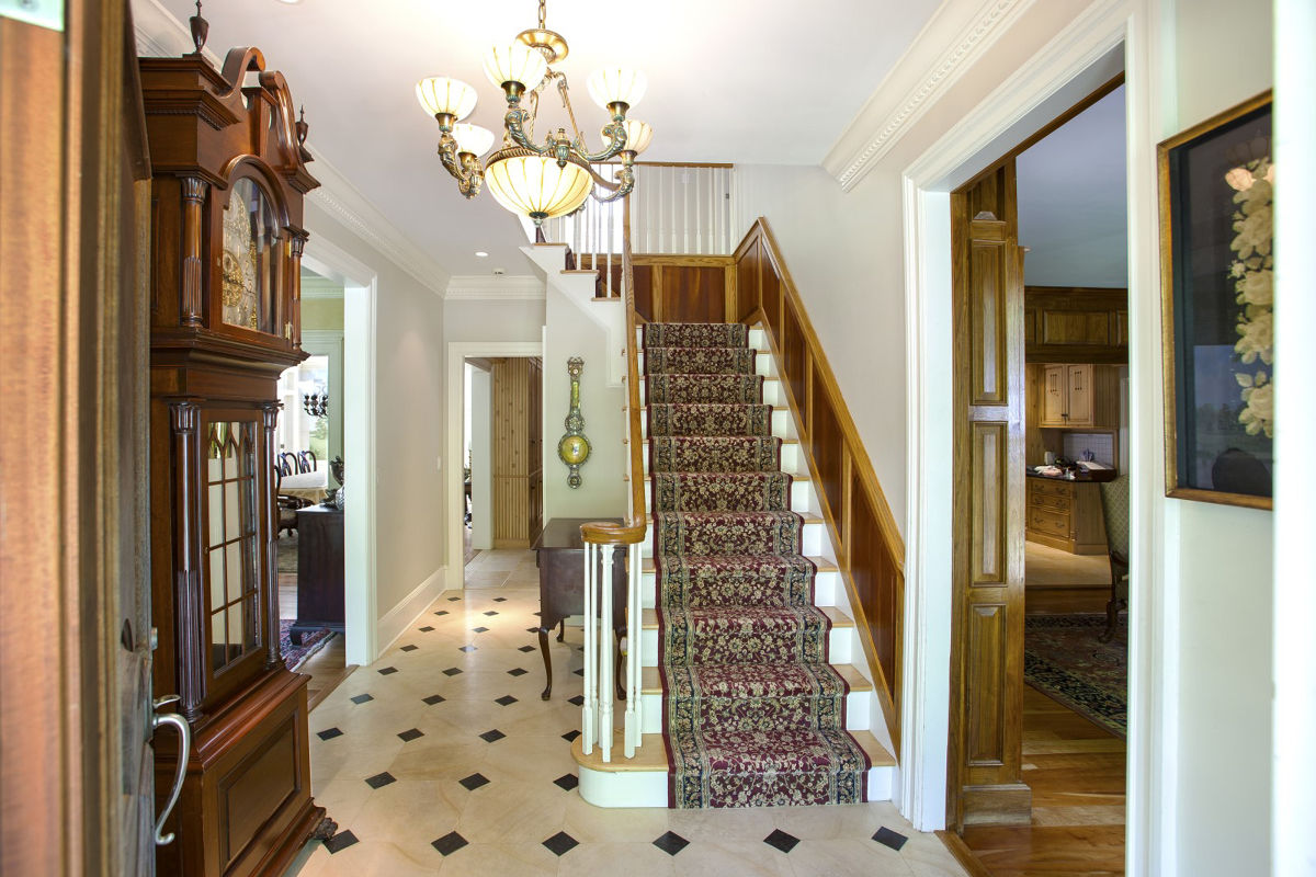 The Foyer of the Main House sets the tone for the visitor on what to expect once further into this home. The Library is immediately to the right, the Living Room is to the left. The hallway brings you down to the Kitchen and the stairway with the raised panel wainscot leads to the second floor bedrooms.