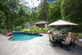 The pool area is truly exceptional, starting with the expansive stamped concrete patio. The 35' by 17' heated gunite free form pool is just a small part of this beautiful area. Wireless control of all pool functions can be managed from the Main House. Outdoor stereo controls and speakers.