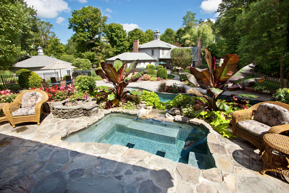 The upper level spa cascades heated water over the natural stone waterfall spill over. Heavily landscaping enhances the beauty of this area. The Gazebo in the rear is a perfect place to escape the sun and perhaps take a nap on a lounge chair or have a drink to cool off.